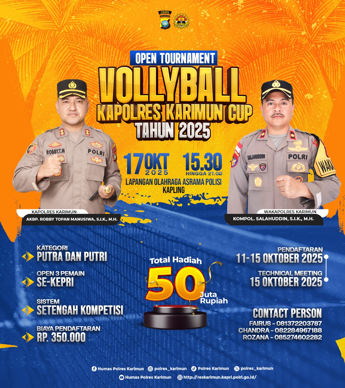 #InformasiSetiapSaat Open Tournament Volly Ball Kapolres Karimun Cup 2025 Resmi Di Gelar By Polres Karimun • October 14, 2025 • 8 Views • Karimun – Dalam rangka meningkatkan semangat sportivitas dan mempererat silaturahmi antar masyarakat serta jajaran kepolisian,...