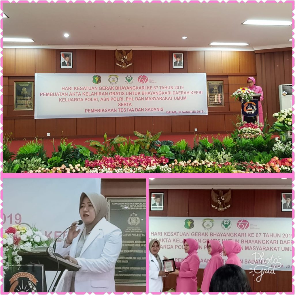 dr. novita dari biddokkes polda kepri melaksanakan kegiatan pemberian sambutan ttg bahaya ca cervix, pemeriksaan tes IVA dan sadanis kpd ibu2 bhayangkari dlm rangka HKGB ke 67 di Polresta Barelang. Giat dibuka oleh Ibu Ketua Bhayangkari dan dihadiri para ibu PJU Polda dan PJU Polresta.