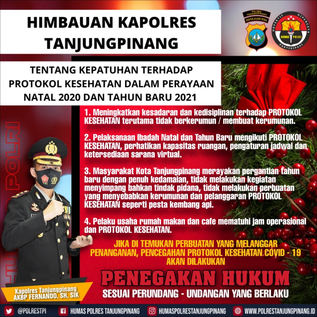 Tanjungpinang, Kepri – Menjelang Perayaan Natal 2020 dan Tahun Baru 2021 Kapolres Tanjungpinang AKBP Fernando, S.H, S.I.K., mengeluarkan Himbauan Kapolres Tanjungpinang tentang Kepatuhan Terhadap Protokol Kesehatan Dalam Perayaan Natal 2020 dan Tahun Baru 2021.