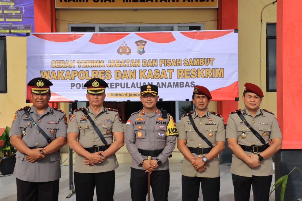 Jabatan Wakapolres Kepulauan Anambas yang baru diisi oleh KOMPOL Shallulahuddin, S.H., yang sebelumnya dijabat oleh KOMPOL Hendrianto, S.H., M.H., dan untuk jabatan Kasatreskrim Polres Kepulauan Anambas yang baru diisi oleh IPTU Alfajri, S.H., yang sebelumnya dijabat oleh IPTU Rio Ardian, S.H., M.H.