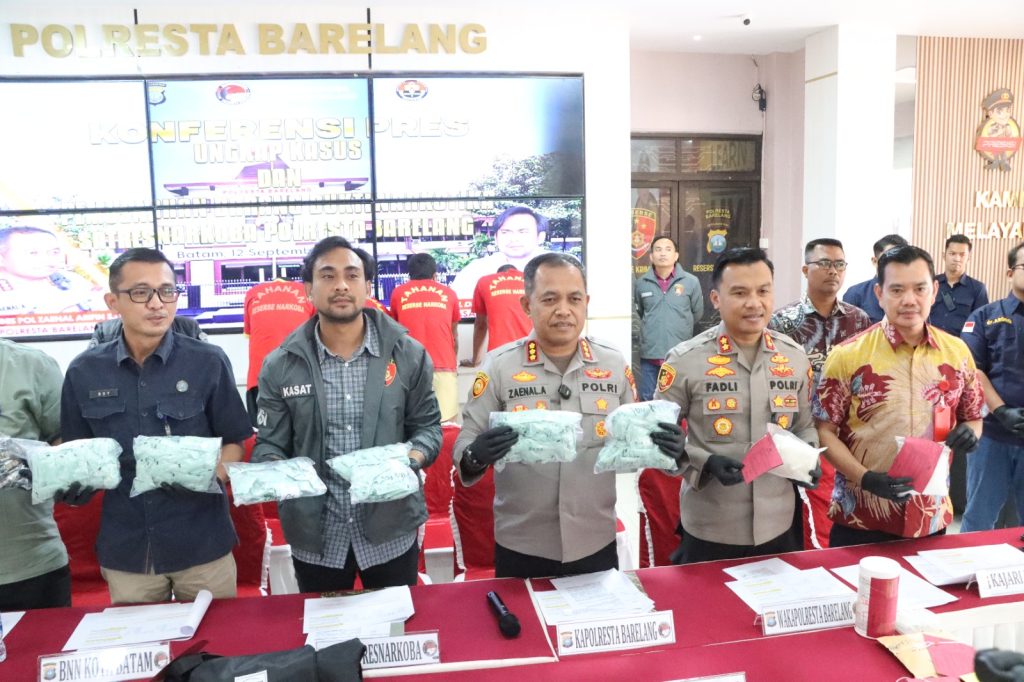 Polresta Barelang – Polresta Barelang melaksanakan konferensi pers terkait pemusnahan barang bukti narkotika serta pengungkapan kasus tindak pidana peredaran obat ilegal. Kegiatan ini dipimpin langsung oleh Kapolresta Barelang, Kombes Pol Zaenal Arifin, S.I.K., didampingi Wakapolresta Barelang AKBP Fadli Agus, S.I.K., M.H., M.M., Kasat Resnarkoba Kompol Deni Langie, S.I.K., M.H., serta Kasihumas Polresta Barelang Iptu Budi Santosa, S.H.. Hadir pula perwakilan dari Kejaksaan Negeri Batam, BNN Kota Batam, BPOM Kota Batam dan Penasehat Hukum. Konferensi pers berlangsung di Lobby Mapolresta Barelang pada Jumat (12/9/2025).