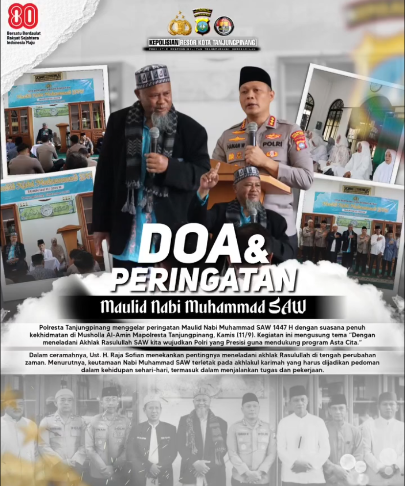 Polresta Tanjungpinang melaksanakan kegiatan doa bersama dalam rangka peringati Maulid Nabi Muhammad SAW 1447 H / 2025 M. Di Mushola Polresta Tanjungpinang, Kamis (11/9/2025).