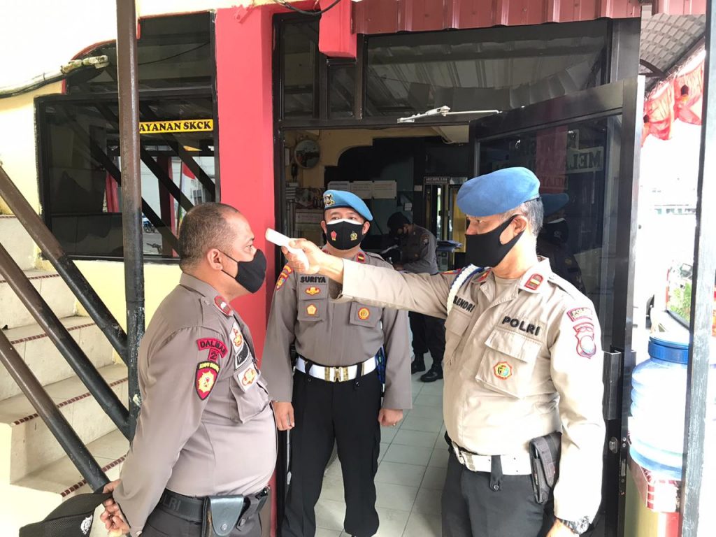 Kasipropam bersama angggota melaksanakan pengawasan dan pengendalian dengan mengunjungi Polsek-polsek dan memberi arahan pada personel untuk konsisten memberikan imbauan dan sosialisasi agar masyarakat membiasakan diri untuk hidup bersih serta selalu mematuhi protokol kesehatan.
