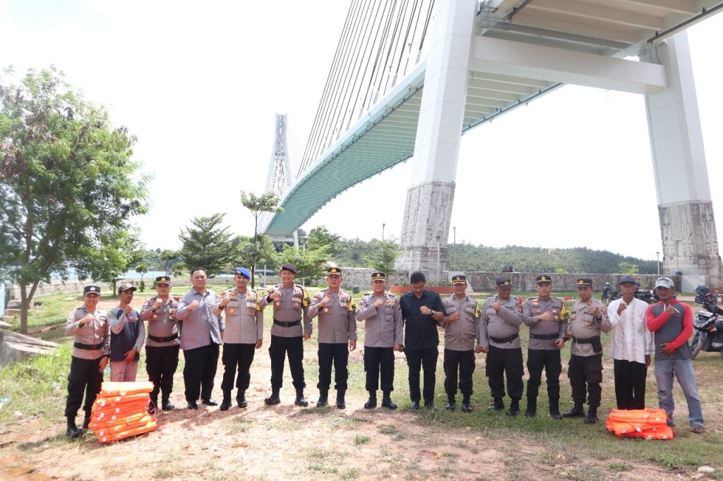 Kemudian Wakapolresta Barelang juga memberikan bantuan Life Jaket kepada Nelayan ataupun Penambang Boat Pancung di bawah Jembatan satu Barelang.